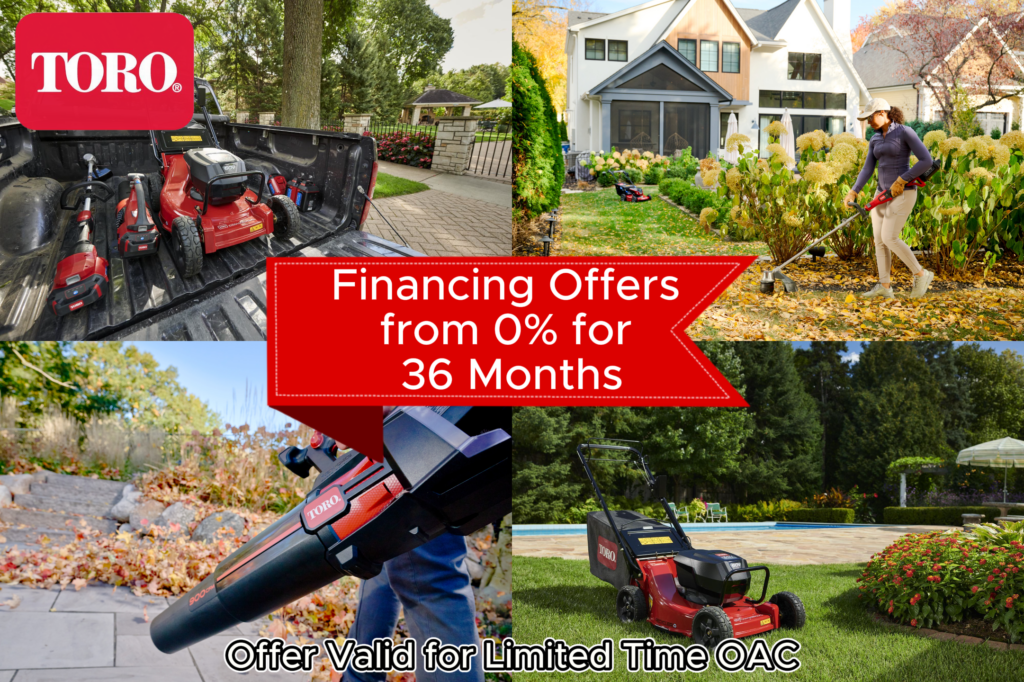 Spring Into Savings! For a limited time only, take advantage of 0% financing for 36 months on Toro lawn equipment (OAC)! Upgrade your lawn game with powerful, reliable Toro tools and equipment without the burden of interest. Get the lawn you want. Pay over time. Visit us in store today to take advantage of this event!