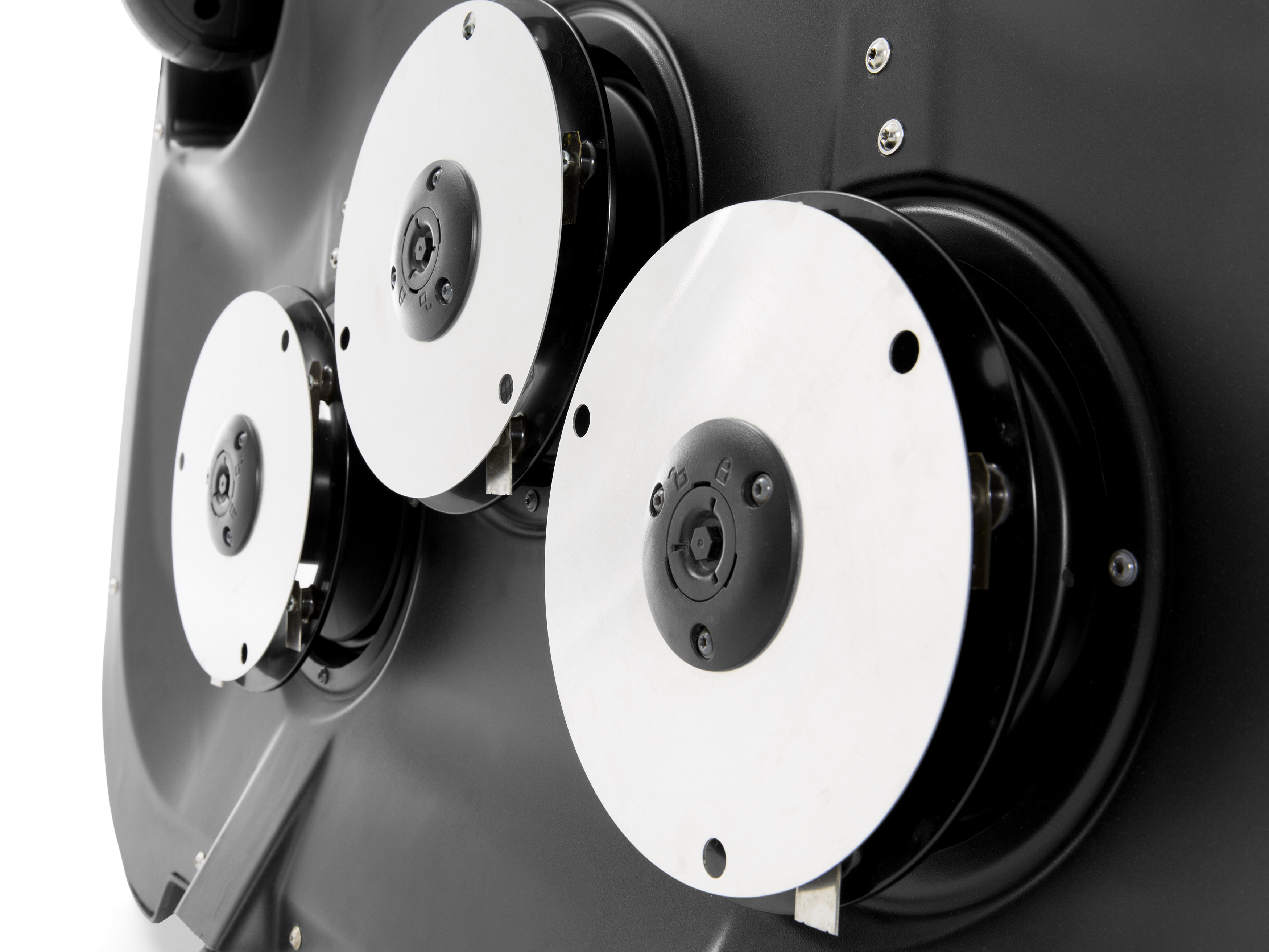 The principle of the cutting system is based on the grass surface being mowed regularly. This means that each blade of grass is cut very little at a time but often, which guarantees a strong, nice-looking and healthy turf. The robust cutting discs are equipped with sharp razor-like blades made of strong carbon steel. This provides efficient operation and extremely low energy consumption.